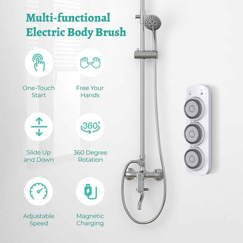 - Intelligent Rotation: The electric shower brush for body is equipped with three 11-inch diameter brush heads that can rotate 360 degrees freely. The brush head is composed of tens of thousands of soft bristles. The three brush heads rotate at the same time to cover a large cleaning area, helping you deep clean and exfoliate without damaging your skin