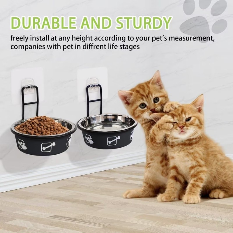 Wall Mounted Cat Food Bowl, Adjustable Elevated Cat Food and Water Bowls, Stainless Steel Hanging Pet Bowls with Stand, Nonslip Pet Feeding Bowls, Raised Cat Bowls for Cat and Puppy 2Pack