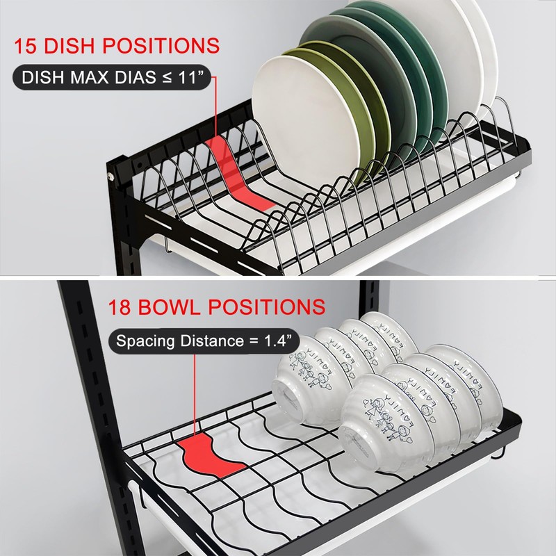 - Strong Load-bearing & Large Capacity : Hanging dish drying rack is heavy-duty and have a big load bearing capacity, which can meet your kitchen need. The black wall dish rack shelf can hold a lot of bowls (around 18pcs), dishes (about 15pcs) , some fruit and vegetables