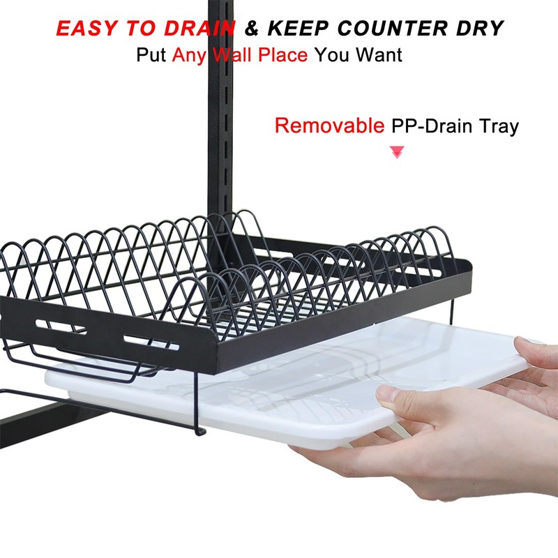 - Easy to Drain & Clean : Wall mount kitchen plate organizer stand is equipped with a separate plastic water tray for pouring water out of dish at any time; Wall mount dish drainer rack is designed to hang on to the mounting seat by means of a slot. It's convenient for you to remove the shelf and clean it