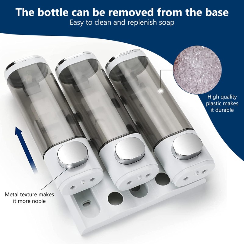 - GENEROUS CAPACITY With three separate chambers, each with 300ml, the dispenser provides enough space for different liquids. This reduces the frequency of refilling and provides a practical solution in everyday life.