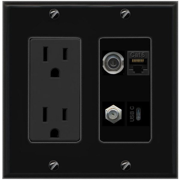 Wall Plate City 3.5mm CAT6 COAX USBC Port Wall Plate Black w Power Outlet