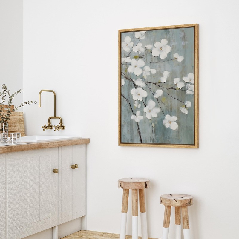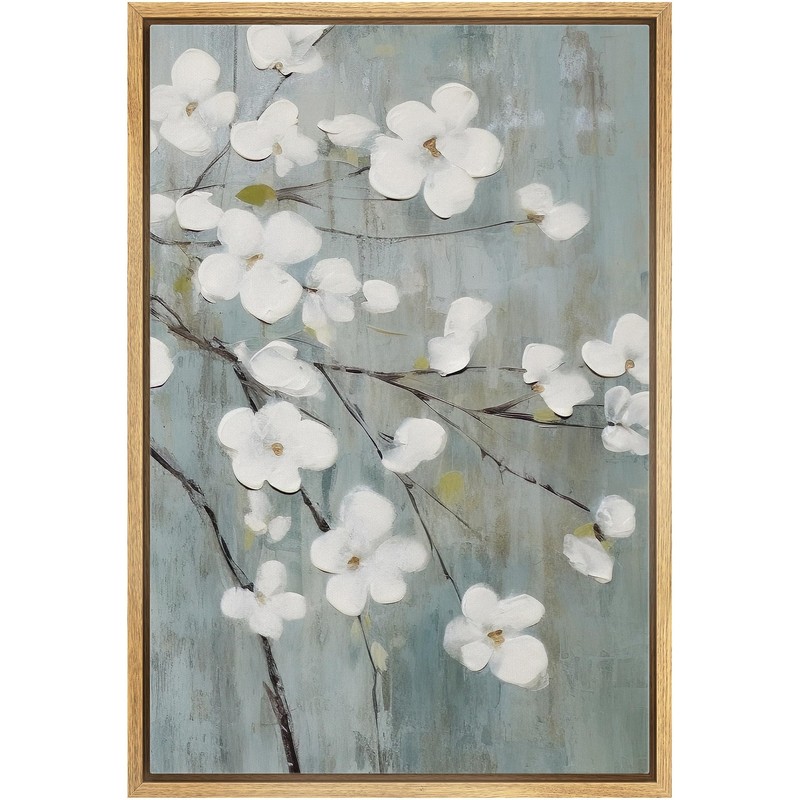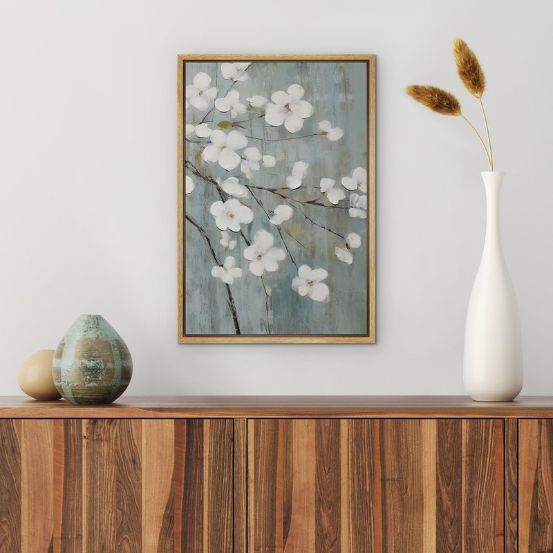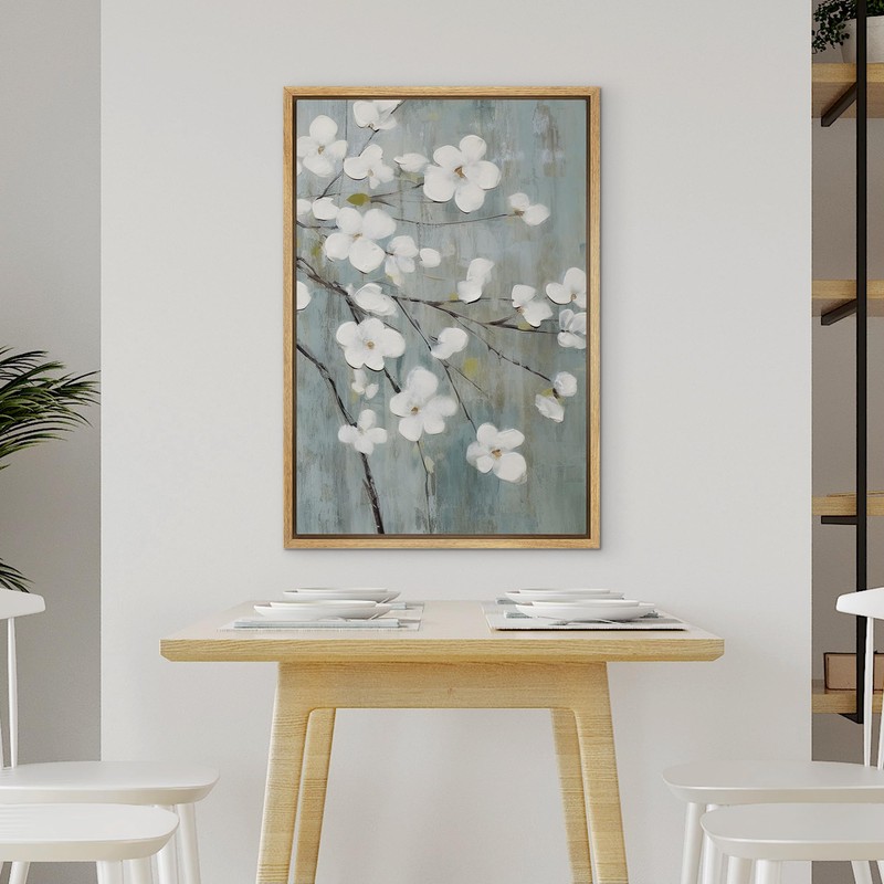 wall26 Framed Canvas Print Wall Art Blossoming White Florals on Blue Nature Wilderness Illustrations Modern Art Decorative Floral Botanical Minimal Calm/Relax/Cozy for Bedroom - 16"x24" Natural