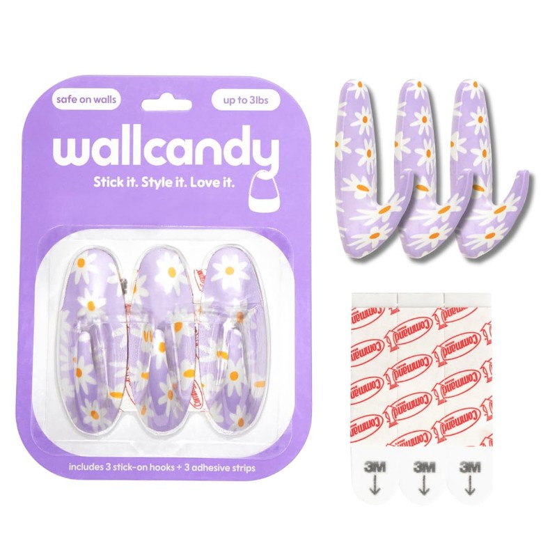 WallCandy Adhesive Wall Hanging Hooks | Pack of 3 Purple Flower Design Self Adhesive Wall Hooks with Heavy Duty Sticky Strips That Hold Up to 3lbs, Easy to Install Hanging Hook for Painted Walls