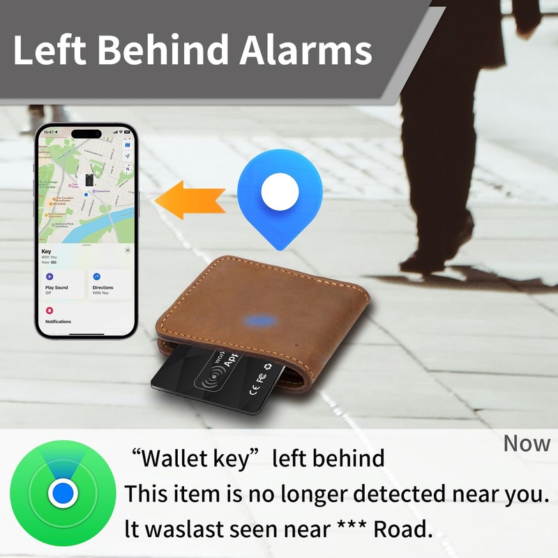 - 🧳【Left Behind Reminder】This Apple Find My Tag makes it easy to find your belongings through the Find My app (iOS only). Simply connect the iPhone Item Tracker to the items you want to monitor. Once your belongings are out of Bluetooth range, our wallet tracker device will instantly send you a reminder within 10 minutes, ensuring you never miss anything again. Please make sure to enable notifications in advance for seamless retrieval.