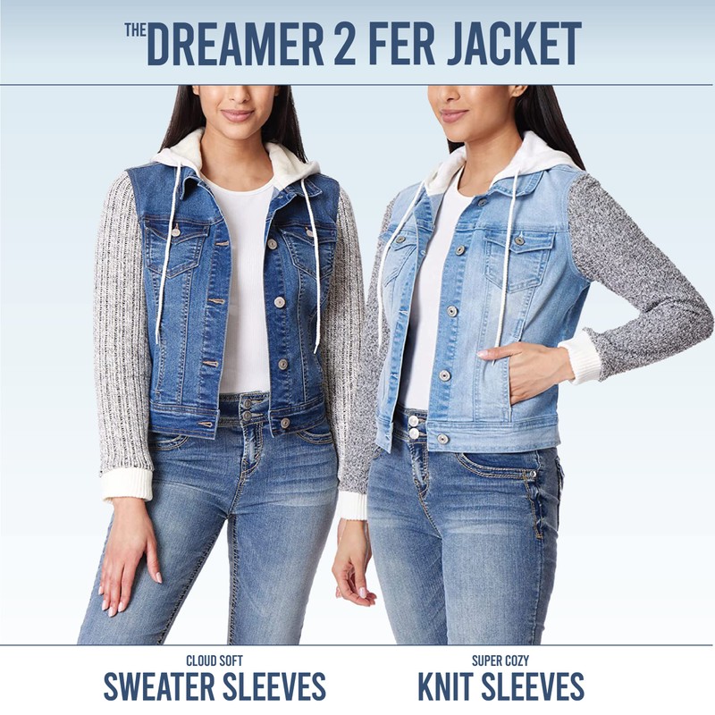 - Your Go-To Denim Hoodie Jacket for Any Adventure—This will be your new go-with-everything jacket and the just-right wardrobe staple. The WallFlower Dreamer Denim Jacket has soft knit sleeves and a perfect denim body for any outing.