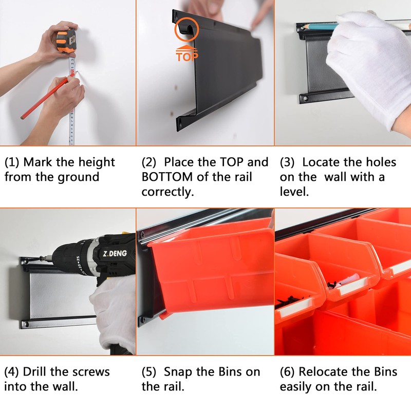 - OPEN DESIGN & EASY TO INSTALL - The lid-free, open design makes it easy to see what’s inside each compartment and also keeps your parts and hardware readily accessible. With 3 rails mounted on the wall, the bins can snap on the rails easily.