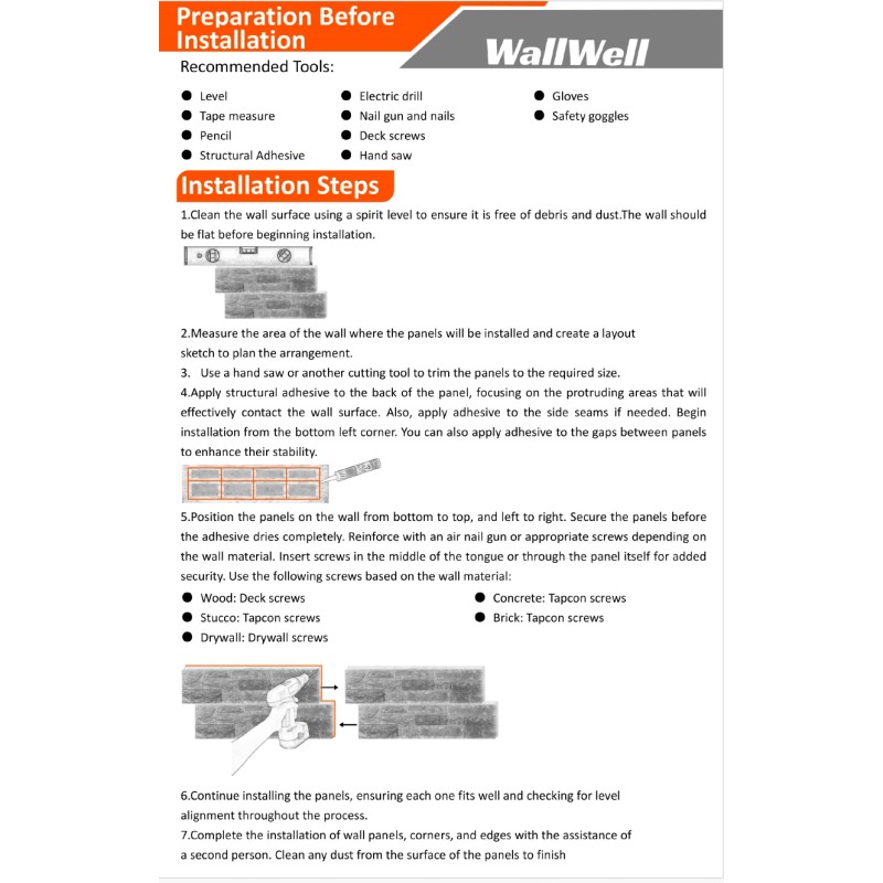 - We recommend using construction adhesive along with screws for installation. Depending on your wall type, different installation methods can be chosen. We suggest using a construction adhesive similar to Loctite PL Premium Construction Adhesive.