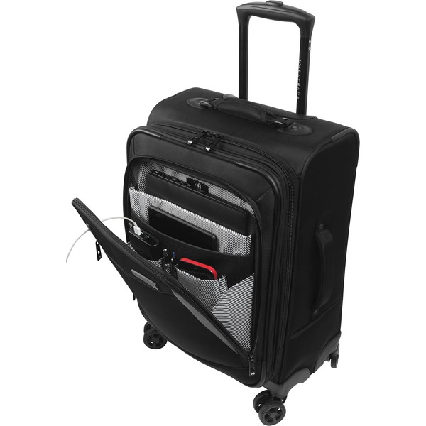 - PACK YOUR ELECTRONICS: With padded interior pockets for your phone, battery charger, tablet, and laptop, this spinner is designed to meet the needs of a traveler. Front pocket is equipped with a “pass through” grommet for your charging cord.