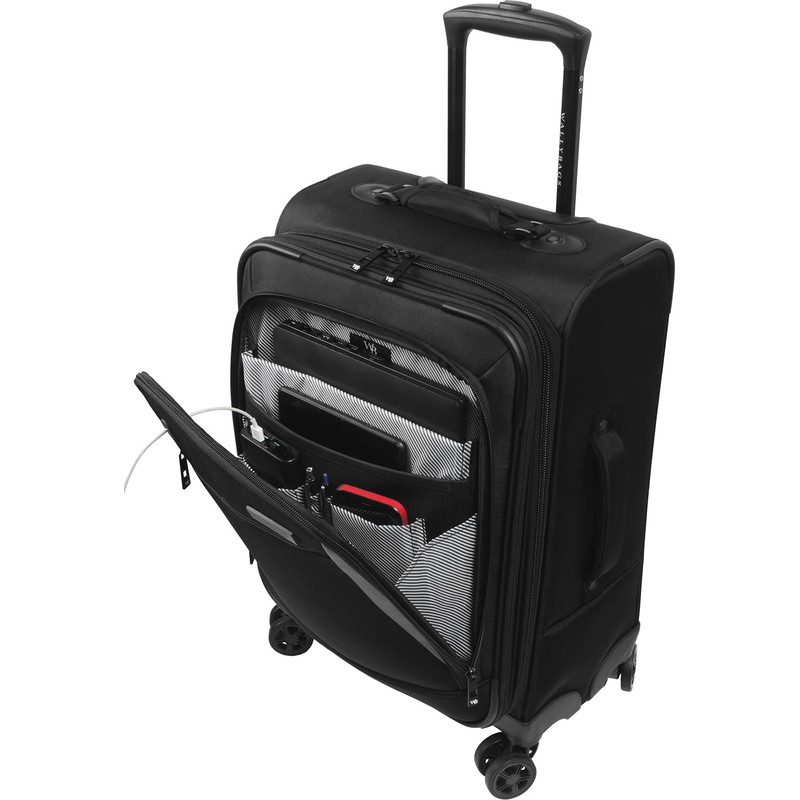 - MAXIMUM ORGANIZATION: The WallyBags Solutions 20” Expandable Spinner Carry-On provides maximum organization with 3 exterior pockets including a pocket for your water bottle, 6 interior pockets, a removable toiletry bag, and hidden key fob. Clothes are secured in place with the adjustable packing divider. Spinner expands an additional 2” for extra packing capacity.