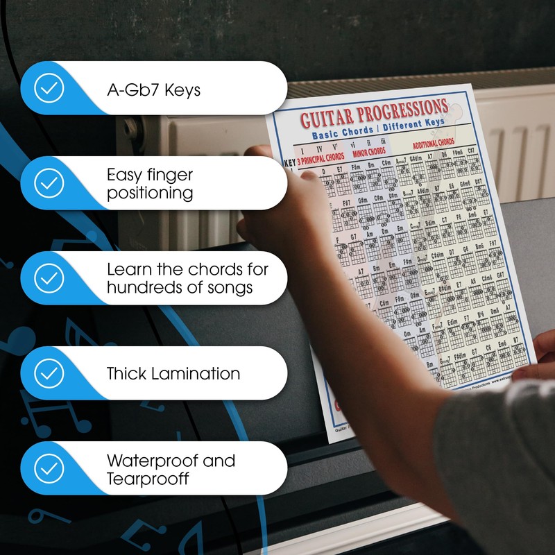 - Easy To Read - Whether you're looking to play with others or use as a quick referencing tool, this guitar chords poster helps you expand your chord vocabulary with all of the major chord progressions in each key! All shown in clear lettering and easy to understand illustrations.