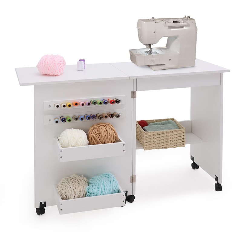 walsport Folding Sewing Table Multipurpose Craft Station & Side Desk with Compact Design, Wheels with Locks,(White)
