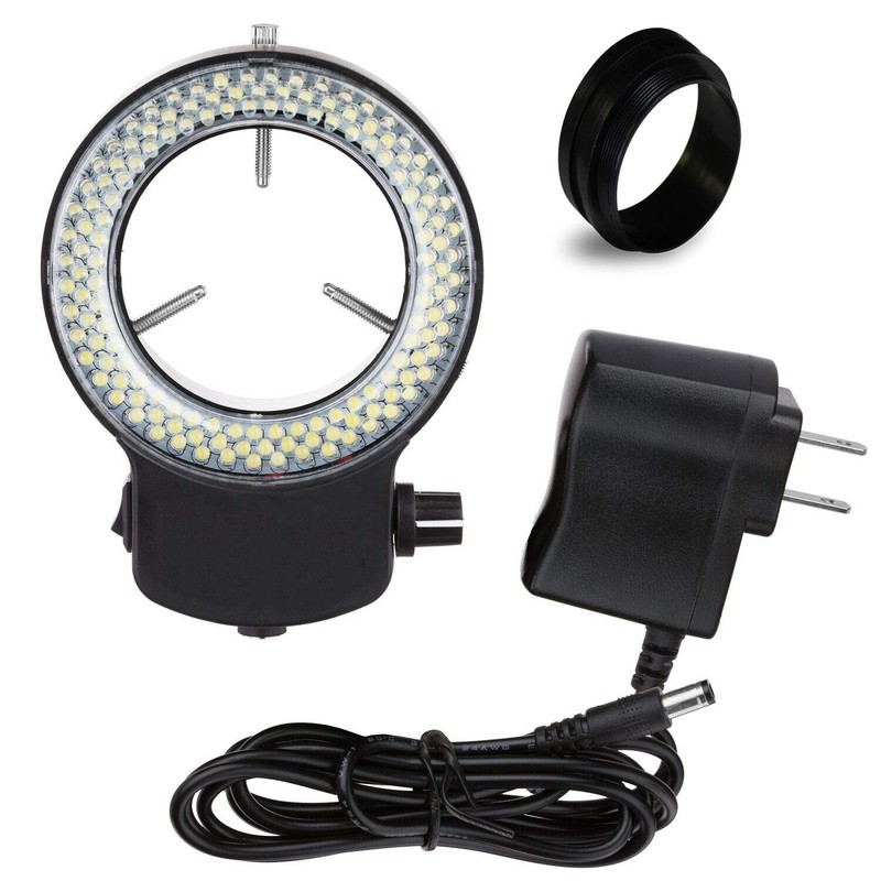 144-LED intensity adjustable ring light for stereo microscopes with mounting size 2.4" (61mm) in diameter. The ring light has 2.5" (62.5mm) inside and 3.64" (92.5mm) overall outside diameters. It works with power supplies from a 100-240V and comes with a 1-7/8" (48 mm in diameter) ring adapter. With variable intensity control, it provides cool, even, intense and focused shadow-free illumination. It is an ideal durable cool light source for all stereo microscopes.