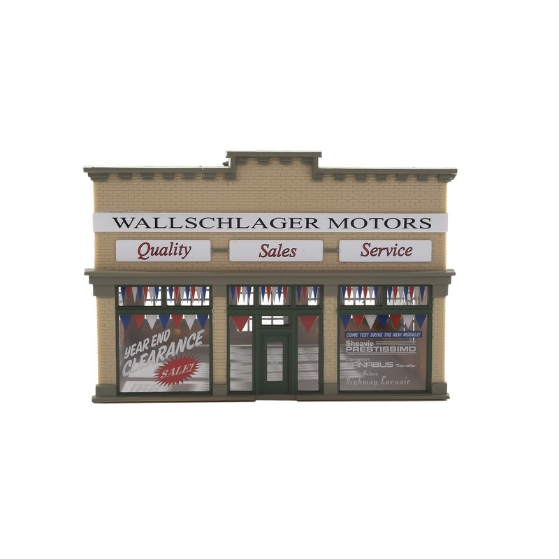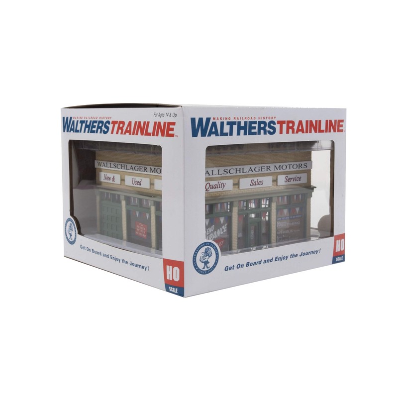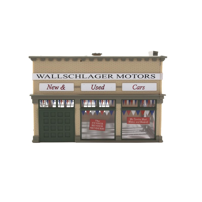 Wallschlager Motors auto dealership is a commercial business that will look great in every small and medium town layout scene. This fully assembled building features parts molded in appropriate colours so there's no painting needed. Colourful signs come applied to the built-up structure and factory- installed windows with realistic printed banners make this building ready to use in any scene along your railroad.
