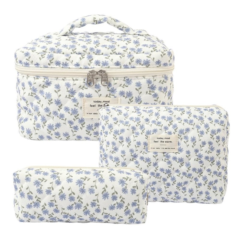 Waltonalice 3 teiliges Reise Kosmetiktasche Set Damen Make up Bag Aesthetic Blumen Große Kulturbeutel Niedliche Make-up-Tasche aus Baumwolle Waschtasche Tragbare Travel Essentials für Frauen Blau