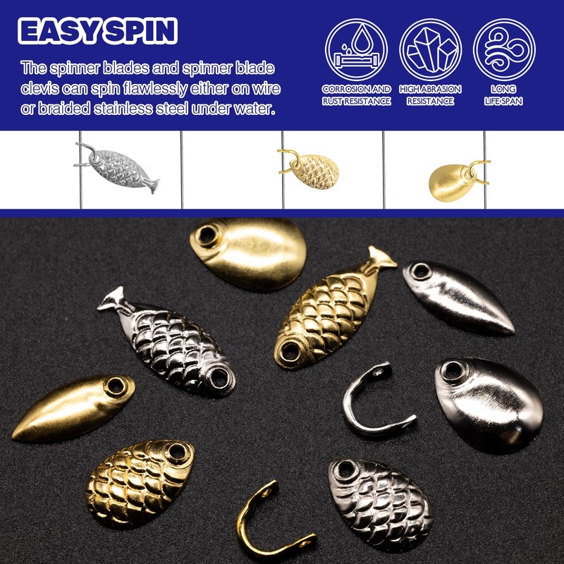 - [DIY you Lures] Easy to put on and easy to take off. You can create some awesome fishing lures with the imagination. Simply add fishing spinner blades and fishing spinner clevis to your favorite bait. The spinner blades and spinner blade clevis can spin flawlessly either on wire or braided stainless steel under water, generating full degree reflection and erratic water flash to attract hungry fishes.