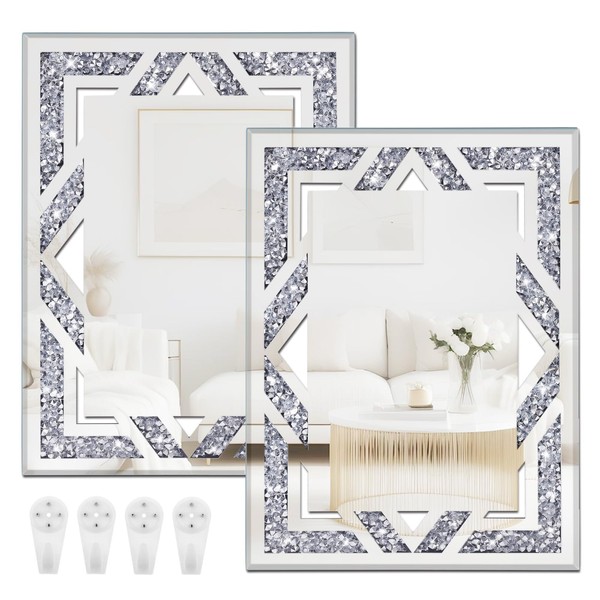 2 Piece Rectangular Hollow Crushed Diamond Decorative Mirror, Silver Crushed Diamond Mirror Decor Wall for Living Room Bedroom Bathroom (11”x15”)