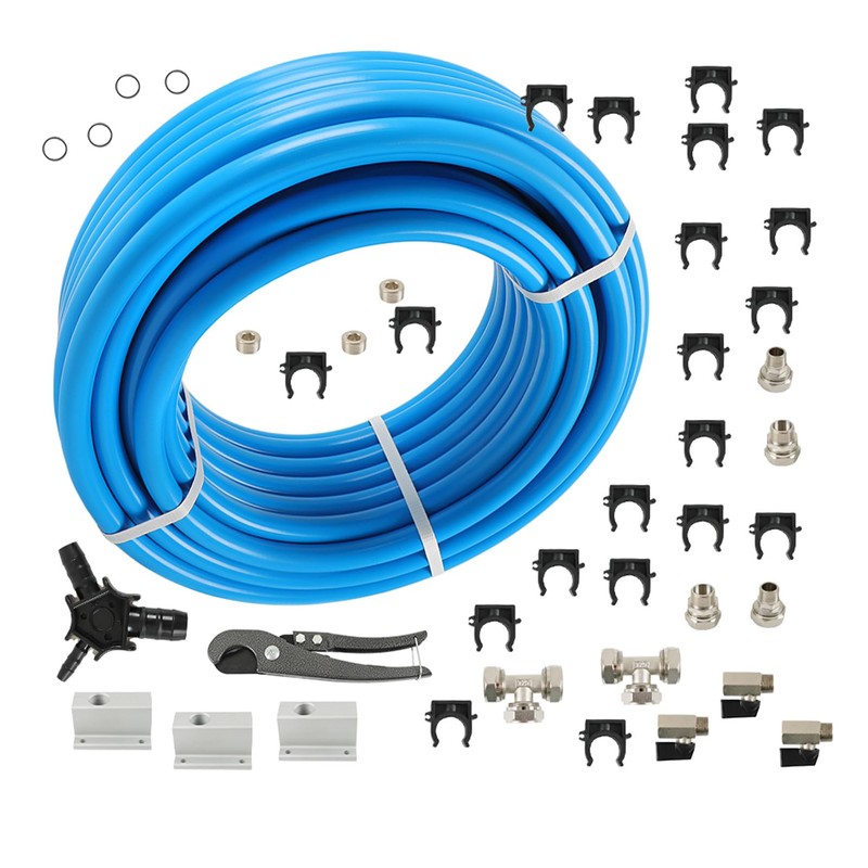 - Includes: 3/4×100 ft HDPE Tubing*1, 3/4 Tubing Tee Fittings*2, 3/4 L Fittings*3, 3/4 NPT Fittings*1, 1/2 NPT Fittings*3, 3/8 NPT Drain Valves*3, 4way Aluminum Blocks*3, Tubing Clips*20, Screws*1pack, Bevel Tool*1, Cutter*1