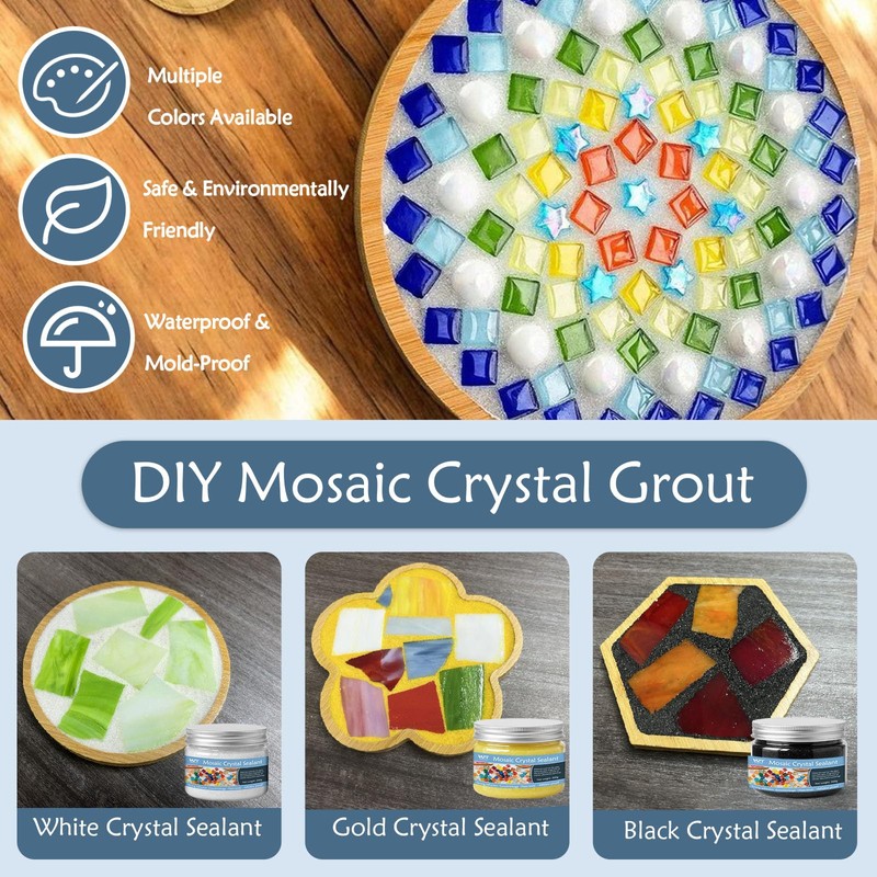 - Our grout for mosaic tile crafts is available in black, white, and gold. Enjoy the fun of creating mosaic patterns with family and friends during weekend leisure time, enhancing family and friendship. Tip: Wipe off excess mosaic grout promptly to prevent drying. Reseal the cap tightly after use.
