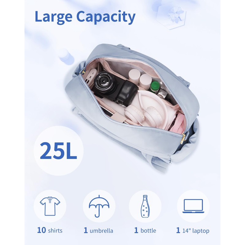 - Laptop Compartment & Wet Pocket: With 25L of storage and 11 organized pockets, this travel duffle bag for women features a padded compartment that fits up to a 14-inch laptop. The waterproof PVC-lined wet/dry pocket keeps damp items (like toiletries or towels) separate from dry contents, ensuring your belongings stay organized and fresh.