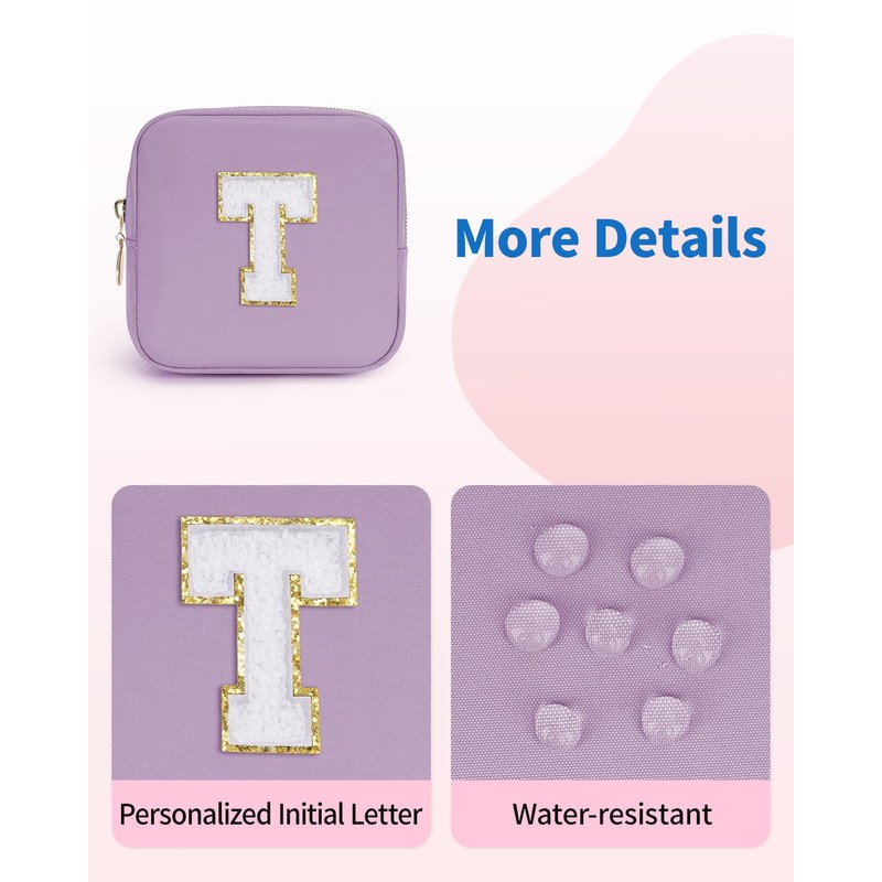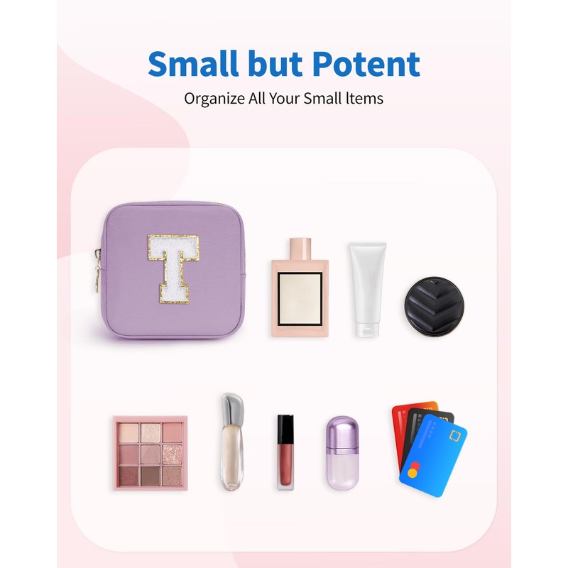 Wandering Nature Personalized Mini Initial Makeup Bag with Glitter Chenille Letter Patch, Small Preppy Makeup Bag with Slip-In Pockets(Patent Pending)
