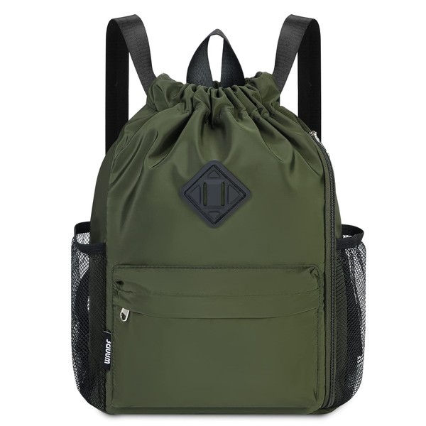 WANDF Drawstring Backpack Sports Bag with Shoe Compartment Water Resistant String Backpack Cinch for Women Men, Dark Green Medium, Rucksack