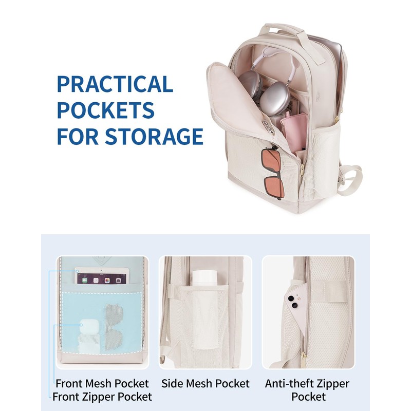 WANDF Travel Laptop Backpack for Women Men, 15.6 Inch laptop Bag College Backpack with USB Charging Port, 18x14x8 Personal Item Bag for Spirit Airlines Carry On Bag for Work (Beige)