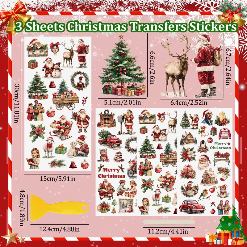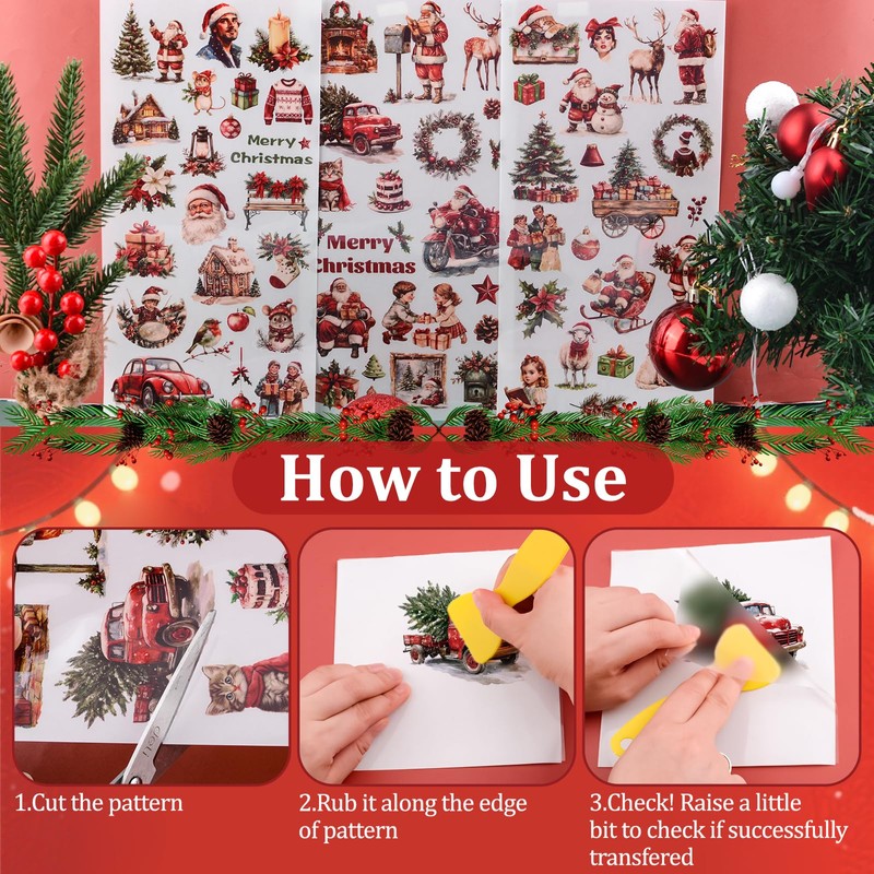 - Packaging Content:You will receive 3 sheets christmas theme rub on transfer stickers, each rub on transfer sticker measures 15*30cm.