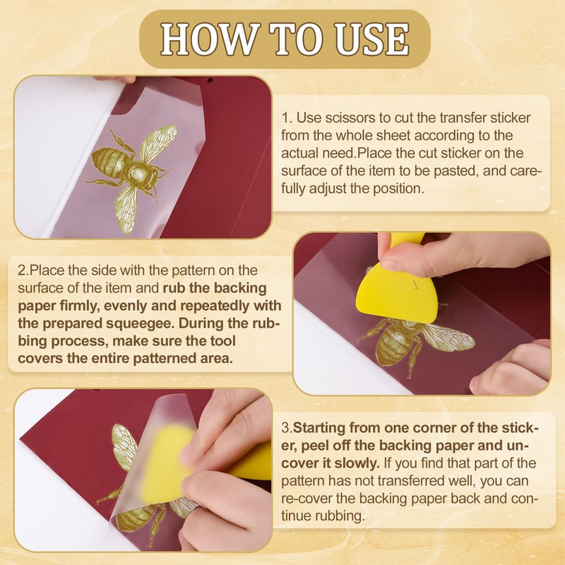 - EASY TO USE: The transfer sticker is quick and easy to use, just cut the pattern you want to use, align the sticker to the target position, rub the sticker evenly and firmly with the included squeegee, and then slowly peel off the backing paper.