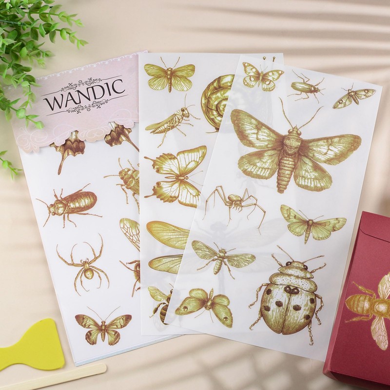 WANDIC 3 Sheets Rub on Transfer Stickers, Gold Decorative Furniture Transfer Decal Butterfly Bee Customized Design Strong Adhesion, for Postcard Scrapbooking Decorations,15*30cm