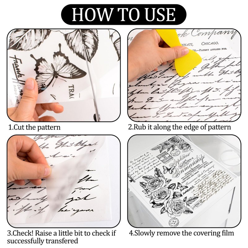 EASY TO USE -- Cut out the transfer pattern, then peel off the white liner, place the pattern face up on the desired surface, gently press the pattern to transfer the pattern, and then simply remove the protective film to finish!