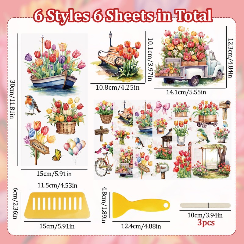 - Package Include: 6 sheets spring tulips scenery rub on transfer stickers. Size: 15*30cm