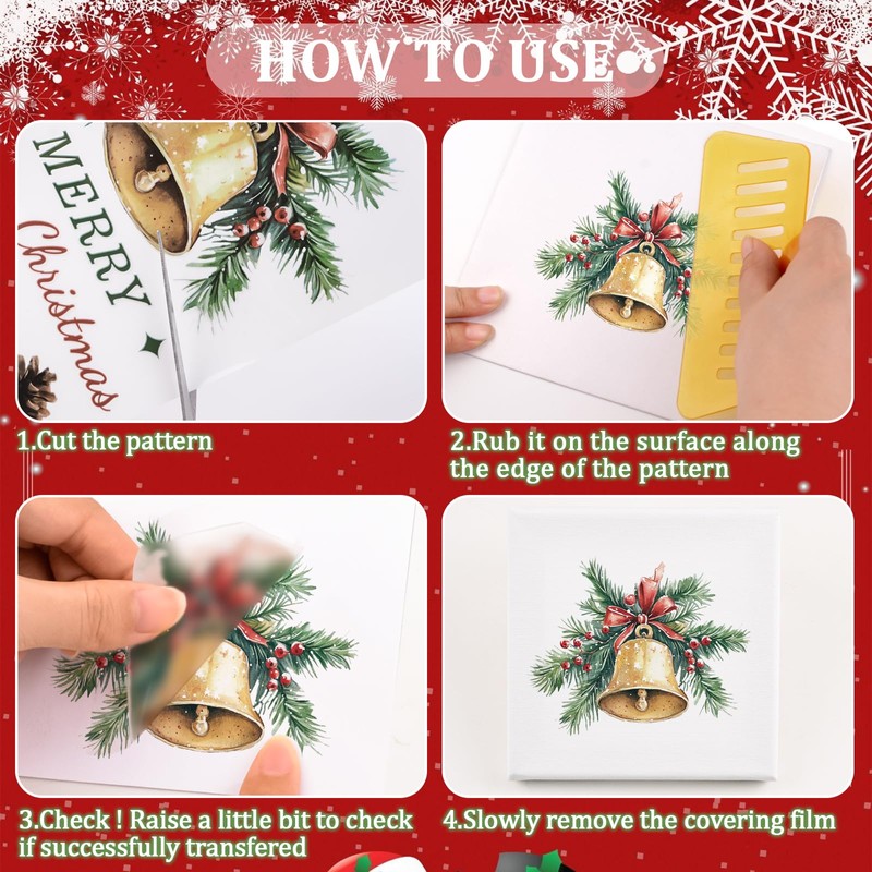 - CHRISMAS THEME -- There are different patterns for the friction on the transfer sticker for you to choose from, including Christmas tree, snowman, reindeer, Santa Claus.