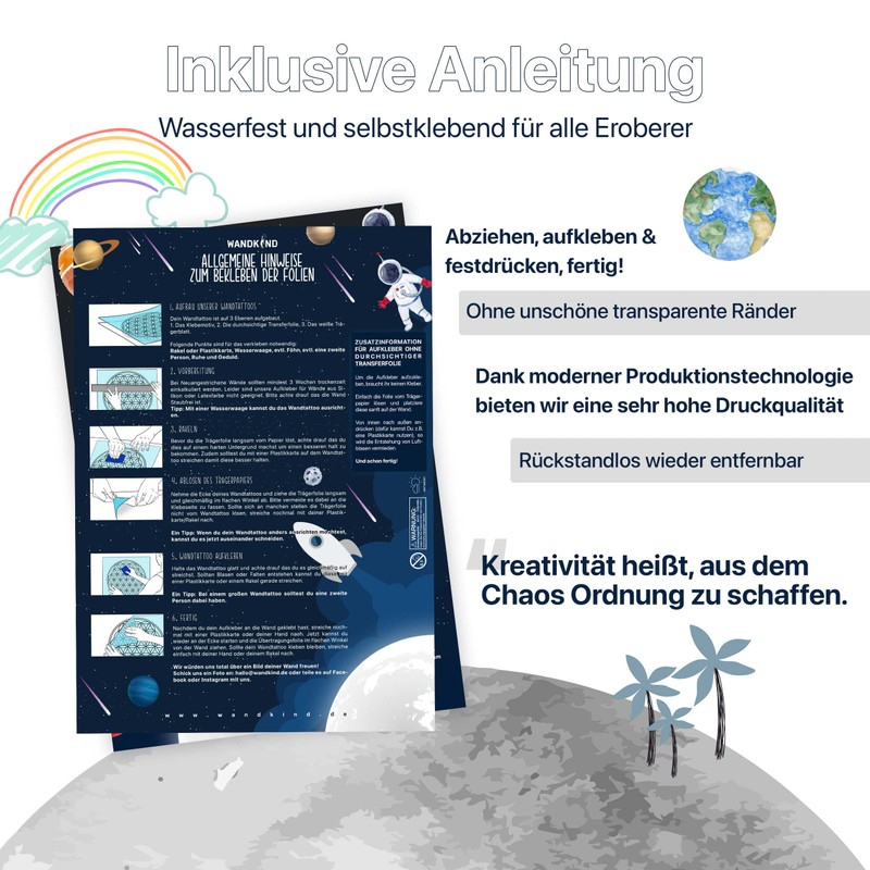 - Made in Germany: We design and design your wall sticker in Germany. The print and cut is also carried out by WANDKIND in Germany. Our contour-cut children's stickers are chlorine- and plasticiser-free and odourless. Therefore ideal for classrooms and nurseries.