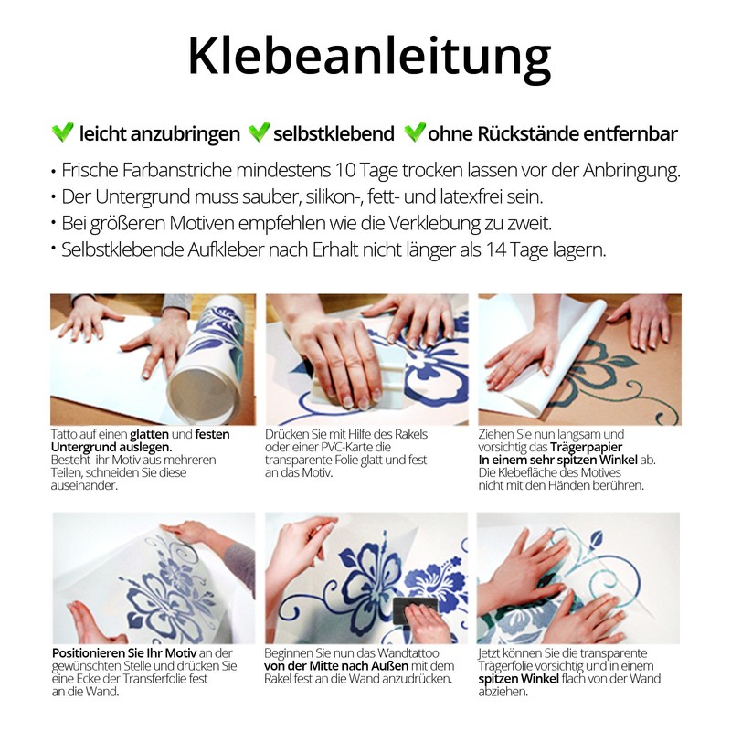 - Easy to apply – so that you can apply the wall stickers stress-free, we provide you with illustrated instructions (English language not guaranteed) as well as a free sample sticker to try.