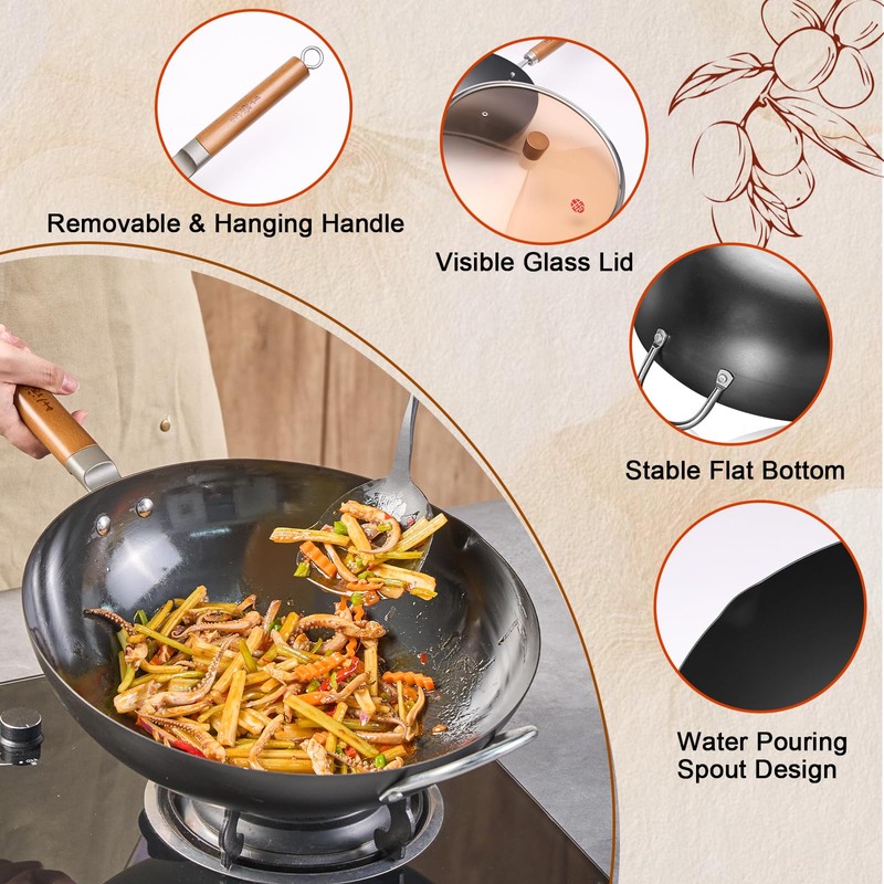 WANGYUANJI 14.2-Inch Pure Iron Wok with Lid, Flat-Bottom Uncoated Stir-Fry Pan for Induction/Gas/Electric, Traditional Chinese Wok with Tempered Glass Lid & Wood Handle