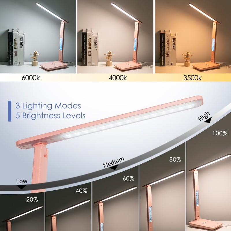 • All-in-One LED Desk Lamp — Featuring a wireless charging station, USB charging port, phone holder, and an intuitive LCD display that displays the Clock, Alarm, Date, and Temperature, this desk lamp seamlessly addresses both your lighting needs and everyday conveniences.