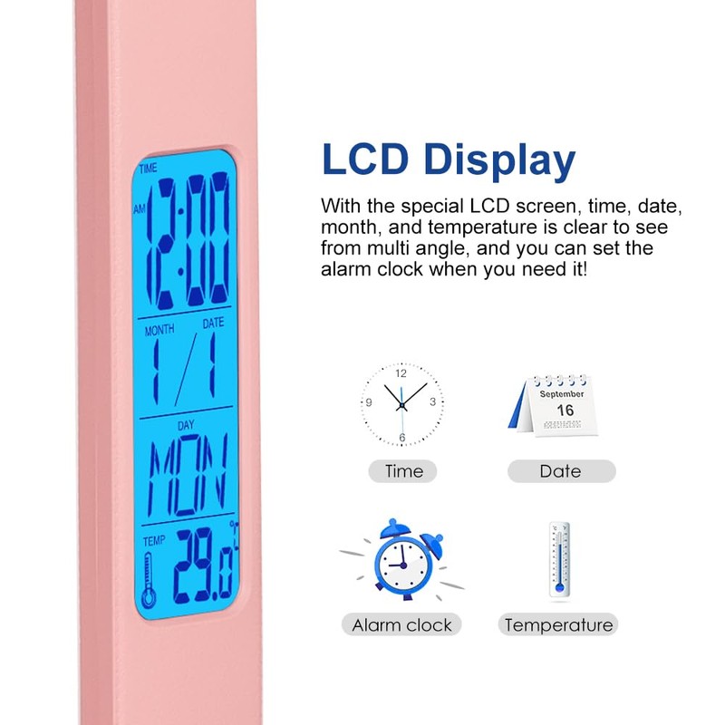 • Modern Clock Lamp — Experience convenience and functionality with our Modern Clock Lamp, which boasts a clock display screen that lets you check the date, time, and ambient temperature directly through the study lamp at any moment. Equipped with an alarm clock function, it doubles as a bedside lamp to gently awaken you in the morning. Perfect for enhancing the ease and comfort of your daily life!