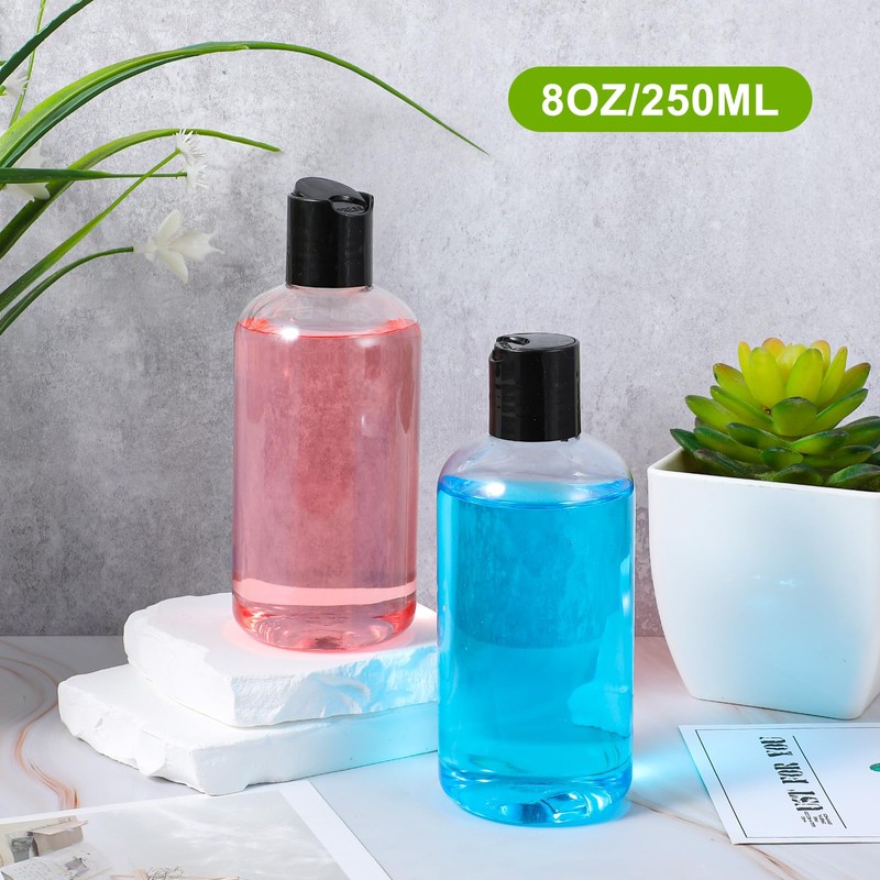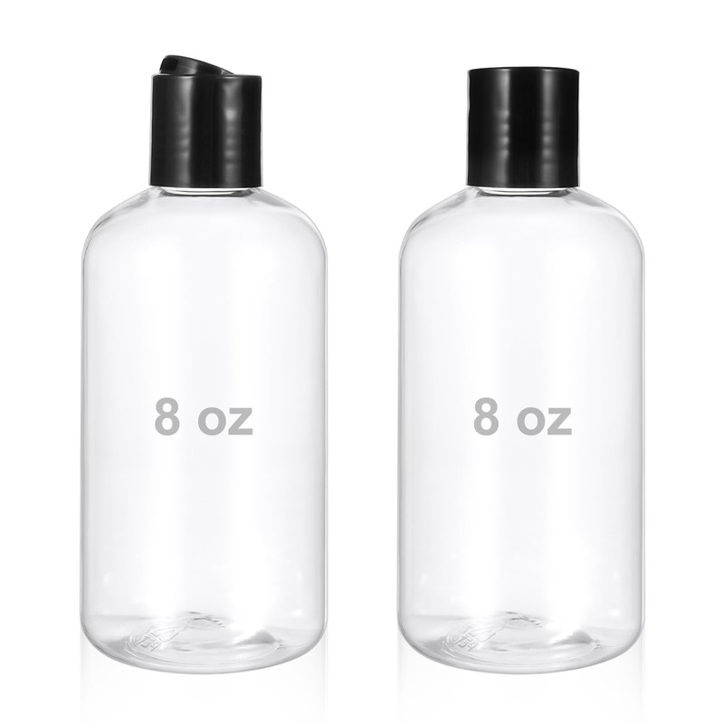 - Quantity: Our squeeze bottles for liquids come in a pack of 2, each with an 8oz/250ml capacity. These clear plastic round bottles are perfect for storing and dispensing your favorite toiletries.