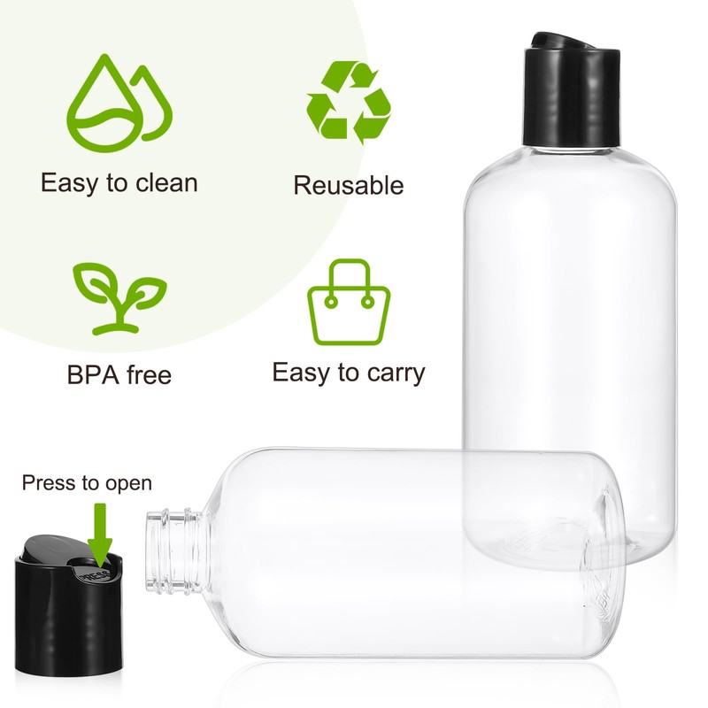 - High-Quality Material: These travel toiletry bottles are made from durable PET plastic, while the black disc caps are crafted from high-quality PP plastic. Both materials are food grade, BPA-free, and designed to be strong, lightweight, and reusable.
