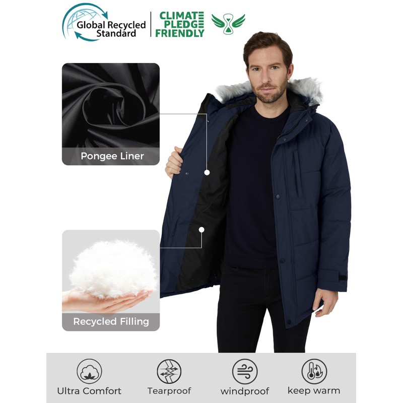 - 100% Recycled Fabric and Filling - Our men's puffer jacket is crafted from fully recycled waterproof fabric with recycled insulation to match. The tough outer shell of this mens coat stands up to tears and everyday wear, ensuring lasting protection.