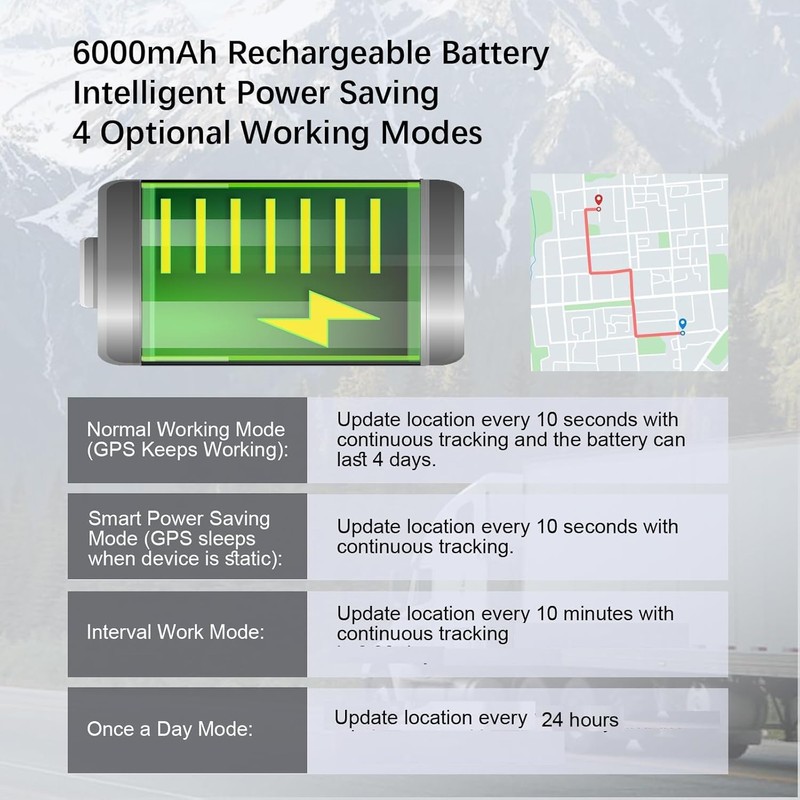 - Ultra Long Battery Life: GPS tracker has a built-in 6000mAh high-capacity battery that can be on standby for up to 90 days if track one time per day:Last up to 15 days in smart energy-saving mode, last up to 45 days if the device track 6-8 times per day