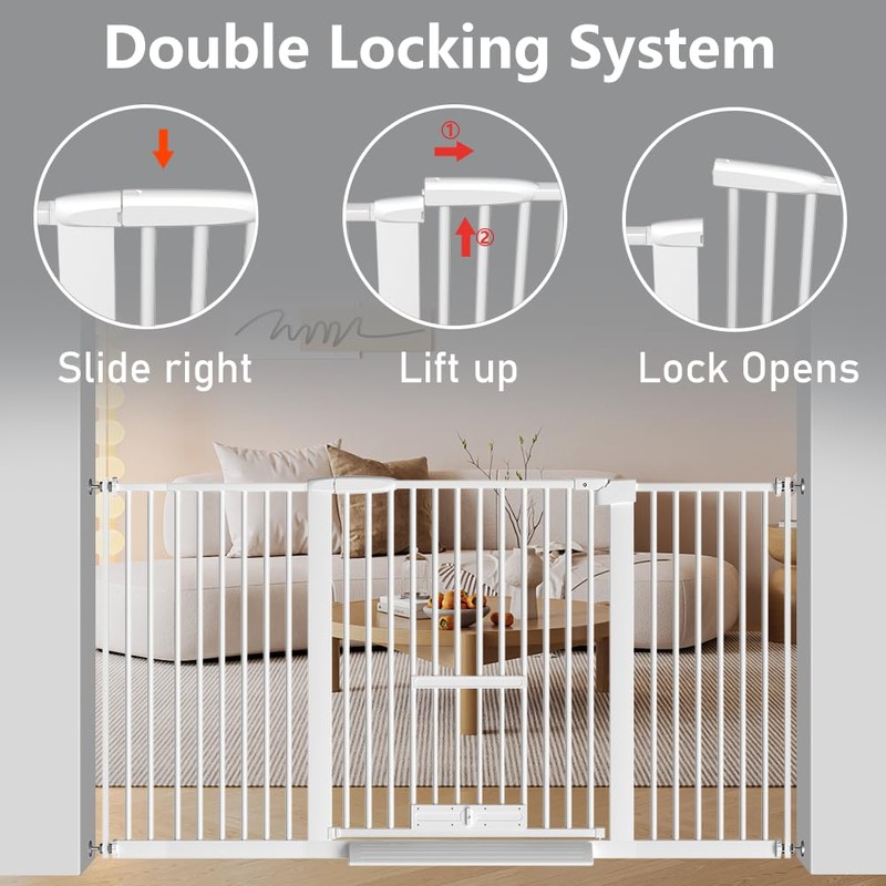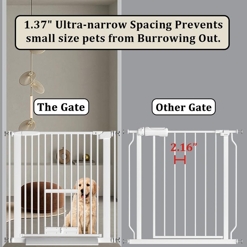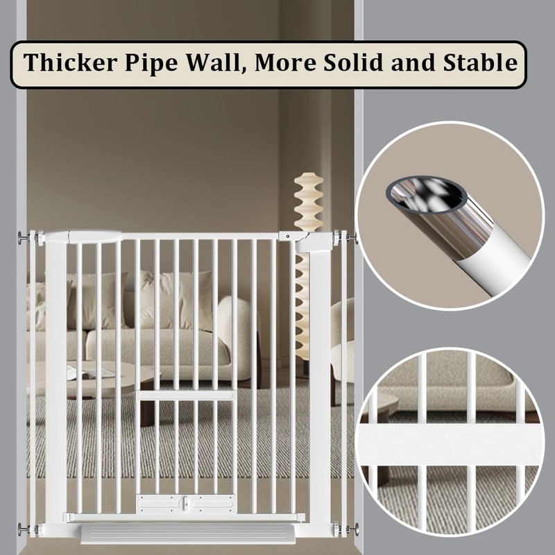 - 【Durable and Safety】The extra wide pet gates with walk through door is made of sleek thick steel,making a safe protective . The spacing between the round tubes is 1.37 ",so it is a perfect choice as a white pressure mounted pet gate with door , which can effectively restrict the entry and exit of pets . After manual testing, extra wide tension gates for kids or pets can withstand 180 pounds of pull.