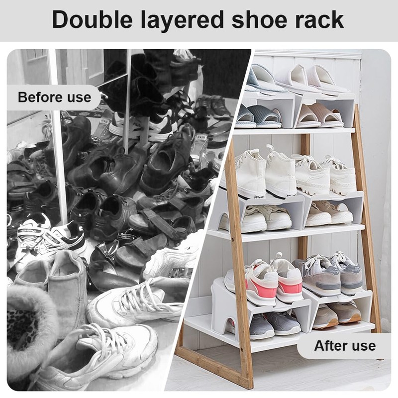 • Space-saving double-deck design - More storage space in a small space. Our double tier shoe rack allows you to store up to 8 pairs of shoes to save space - simply place them on top and bottom. So you always keep track of things and create more order in your home