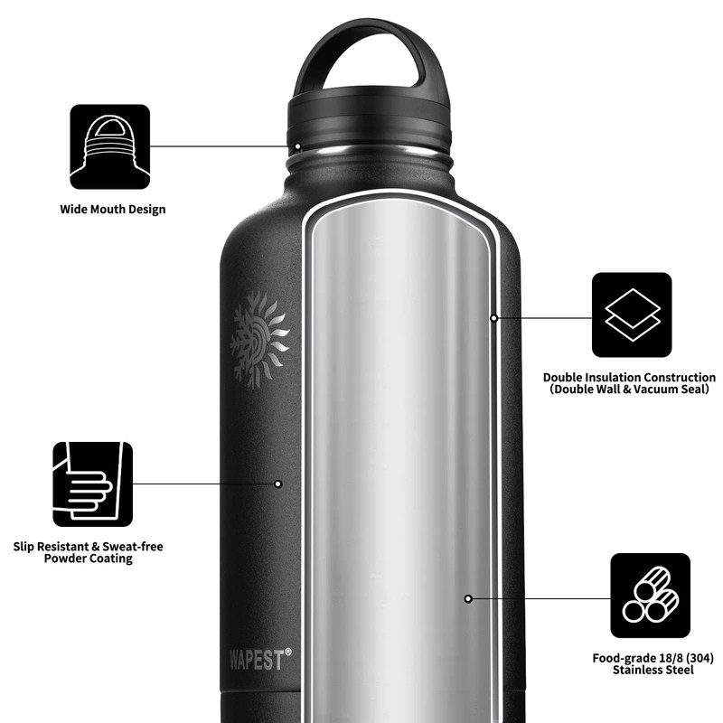 - SUPERIOR MATERIAL: Our stainless steel insulated water bottle is made of food-grade 18/8 stainless steel, this metal water bottle is durable, non-toxic, BPA-free, and odorless. The classic Anti-sweat coating shell of the WAPEST insulated water bottle is textured, non-slip and easy to grip.