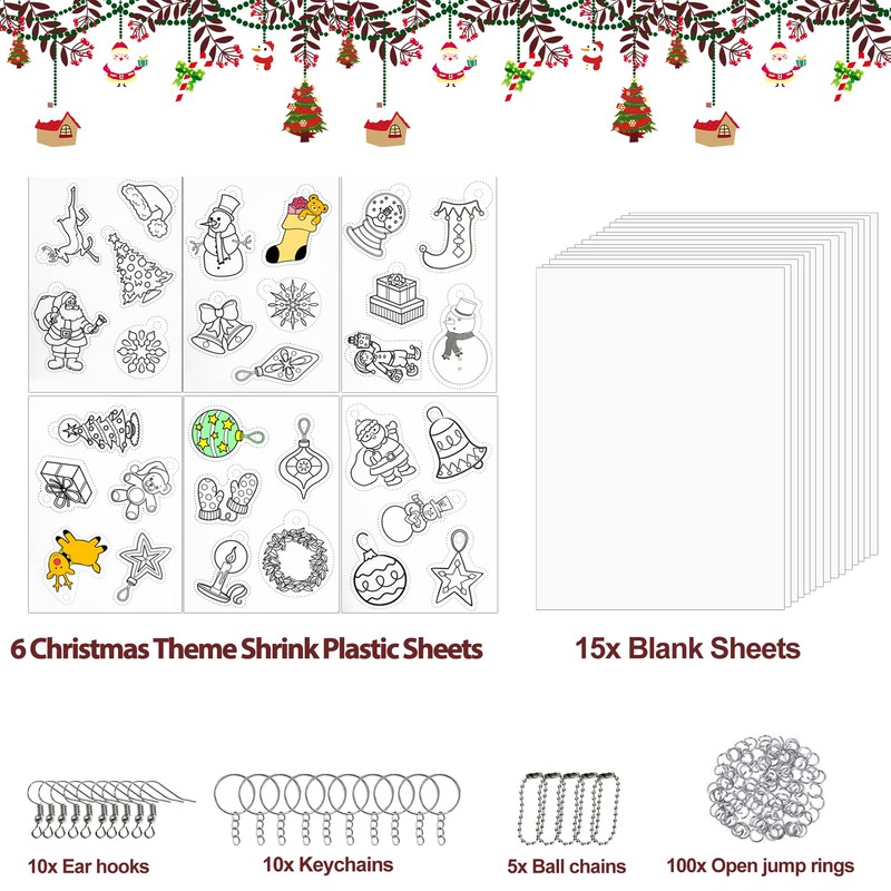 - Christmas Craft Kit: This 146 shrink plastic sheet set includes:6 Pcs Traceable Christmas Shrinky Plastic Paper and 15 Pcs Blank Shrinky Plastic Sheets,10 keychains,5 ball chains,10 ear hooks, and 100 open jump rings.Comes with everything you need!