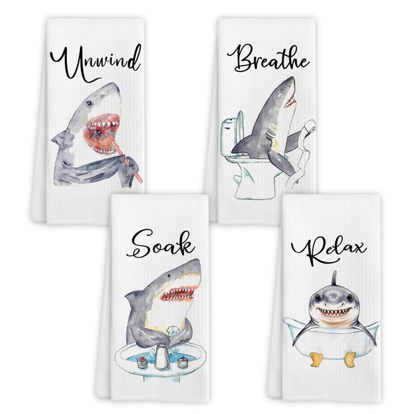 WARDOS Coastal Beach Shark Hand Towels for Bathroom Set of 4, Ocean Marine Shark Relax Breathe Soak Unwind Decorative Hand Towels for Gym Yoga Spa Bathroom Decor, 16x24 Inch