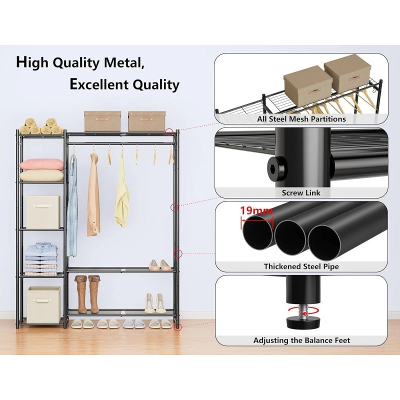 Sturdy and Durable: The wardrobe organizer measures 45.67*11.81*61.81 inches. This hanger is made of thick metal tubing, ensuring excellent durability. The diameter of each main steel pipe is 19mm, ensuring bending resistance. The wardrobe system uses screw-fastened steel pipes to provide stability and sturdiness. Additionally, adjustable balancing feet enhance stability on any surface. Each storage compartment can hold up to 60 pounds.