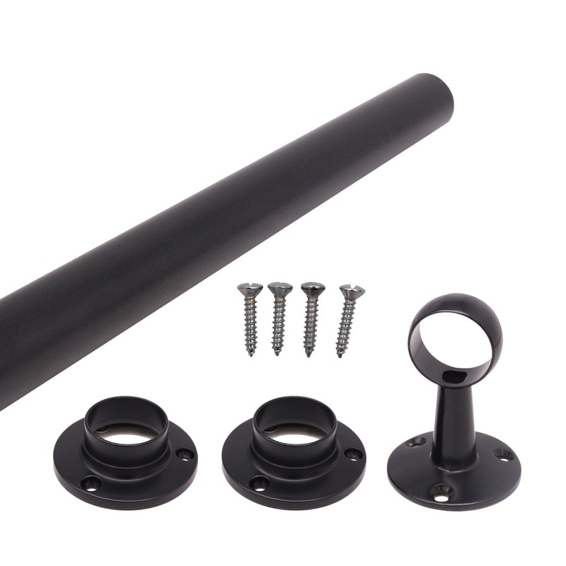 Wardrobe Rail Black Mounted Kit for Clothes Hanging (1 rail, 2 end sockets, 1 centre bracket, screws) (25 x 1829 mm)