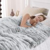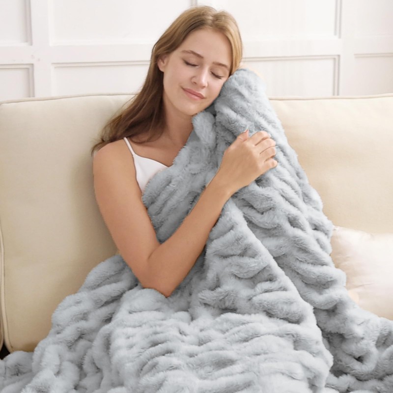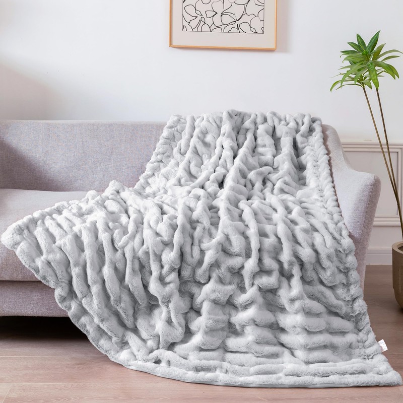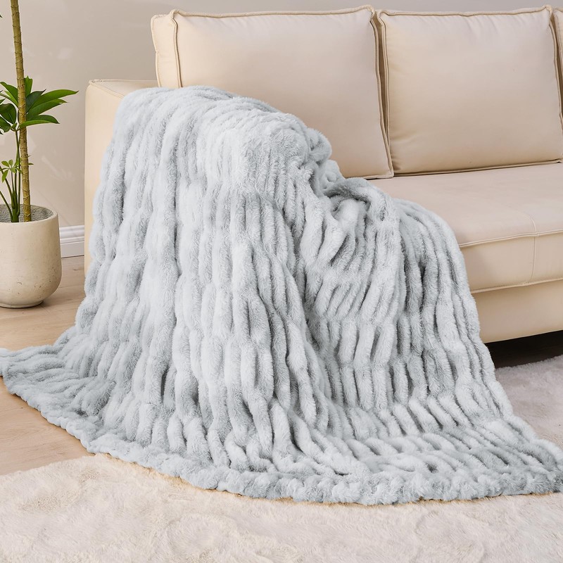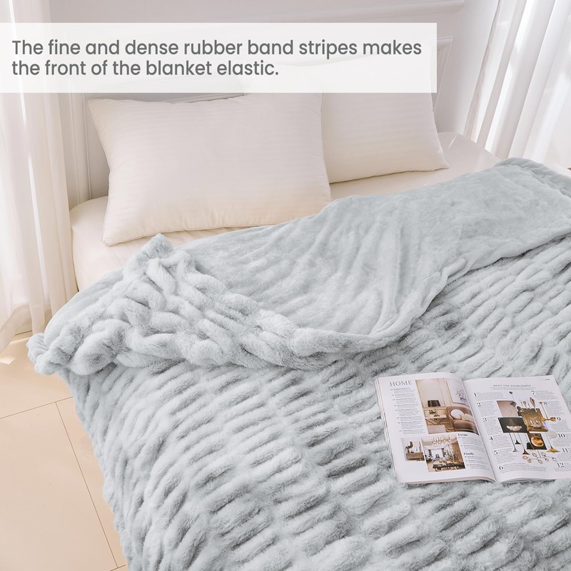 - Double-Sided Faux Fur Blanket: High-grade striped rabbit faux fur face design in light grey color, makes this throw blanket feel warmer and bright. The skin-friendly flannel fleece fabric in reverse gives you a more cozy feeling.